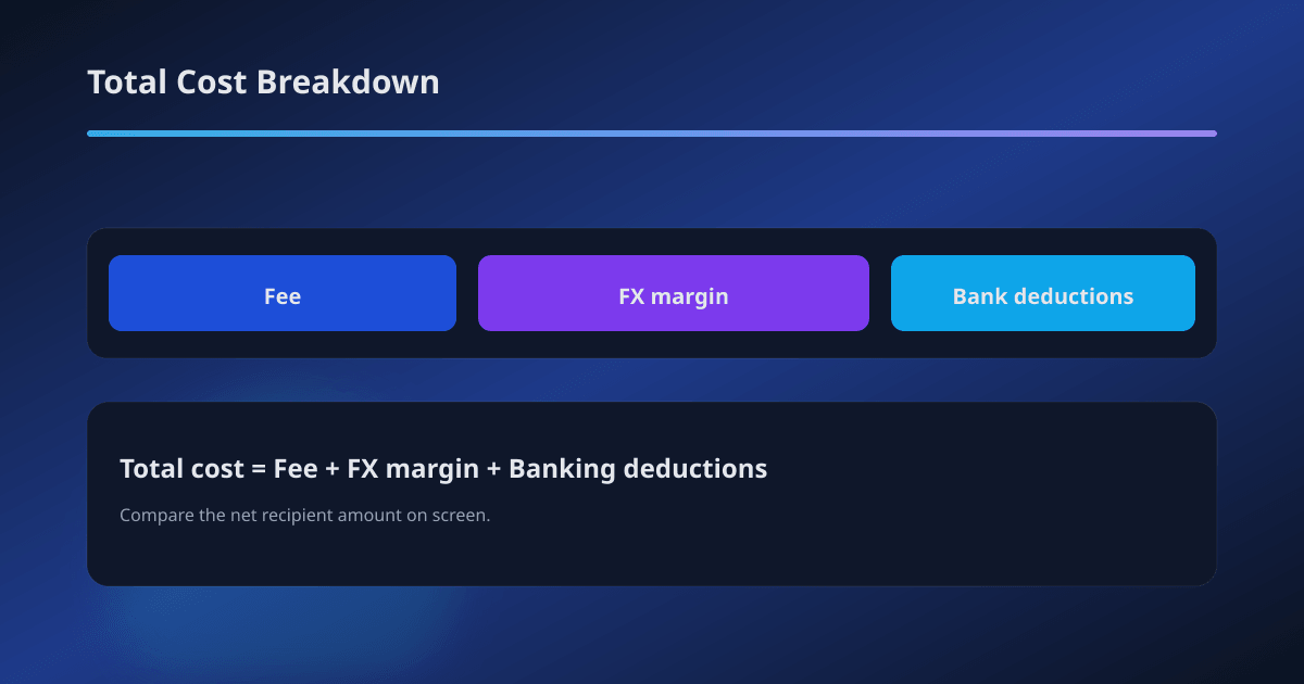 Total cost ≈ transfer fee + FX margin + (if applicable) banking deductions.